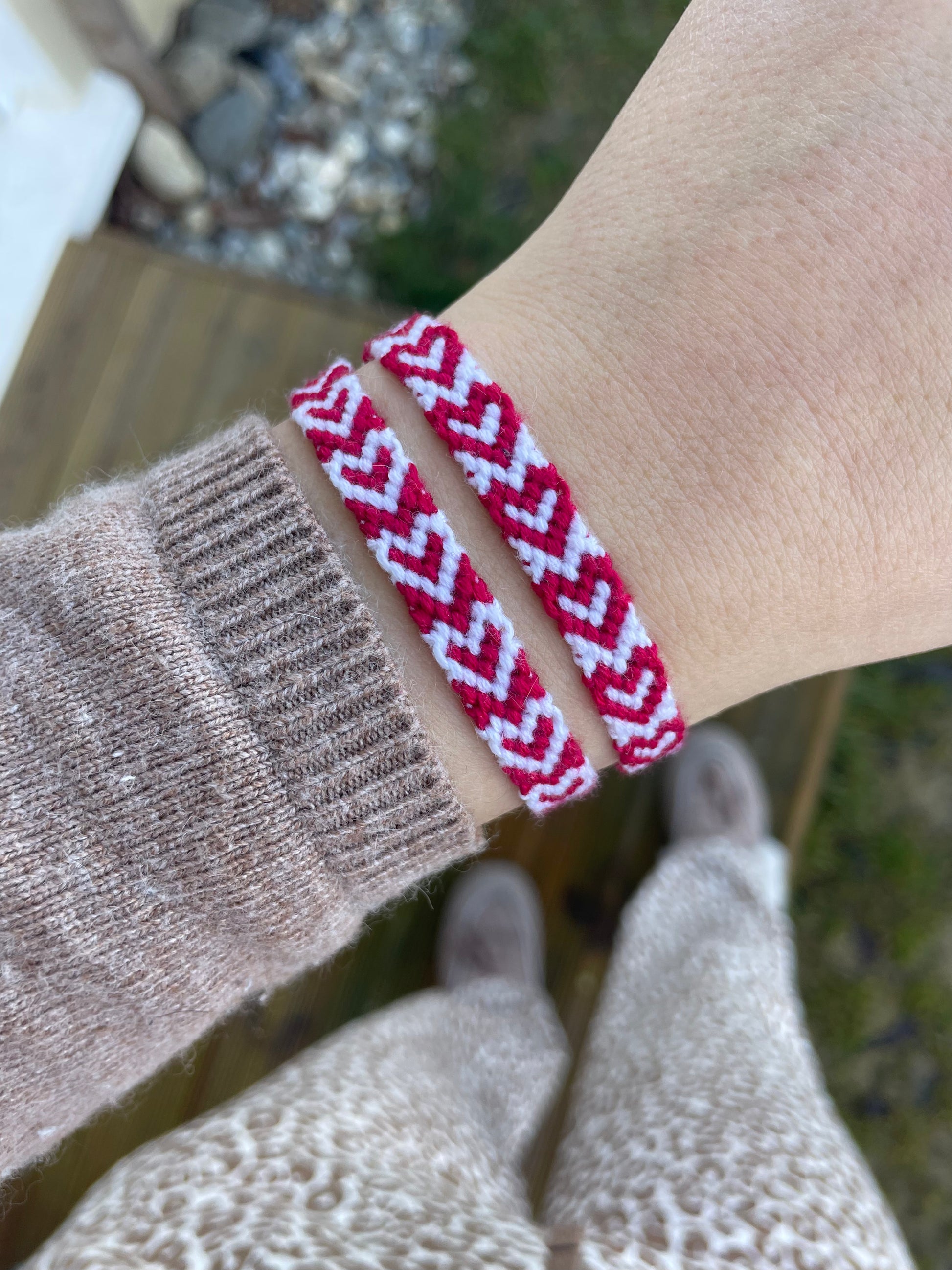 Description produit : le duo est composé de deux bracelet brésiliens tissés en motif de gros coeurs, l'un avec des coeurs Bordeaux foncés sur fond blanc, l'autre avec des coeurs blancs sur fond Bordeaux.